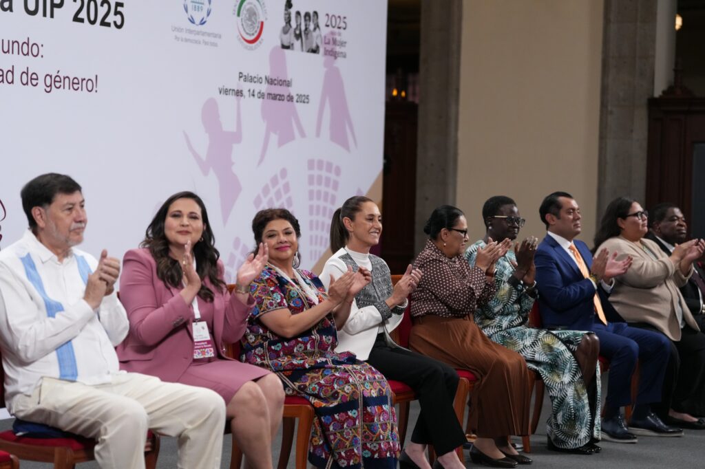 En el presídium, acompañaron a la Presidenta, la secretaria de Gobernación, Rosa Icela Rodríguez Velázquez; la secretaria de las Mujeres, Citlalli Hernández Mora; el presidente de la Mesa Directiva de la Cámara de Diputados, Sergio Gutiérrez Luna; el presidente de la Mesa Directiva del Senado de la República, Gerardo Fernández Noroña; y el secretario general de la Unión Interparlamentaria, Martín Chungong.