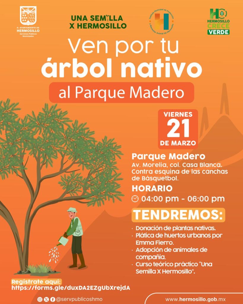 Hermosillo, Sonora; 19 de marzo, 2025.- Para celebrar el inicio de la primavera, el Ayuntamiento de Hermosillo a través de la Dirección de Parques y Jardines, tendrá este viernes 21 de marzo una donación de 500 árboles nativos, y en esta ocasión además contarán con especies como Guamúchil, lavanda y albahaca.