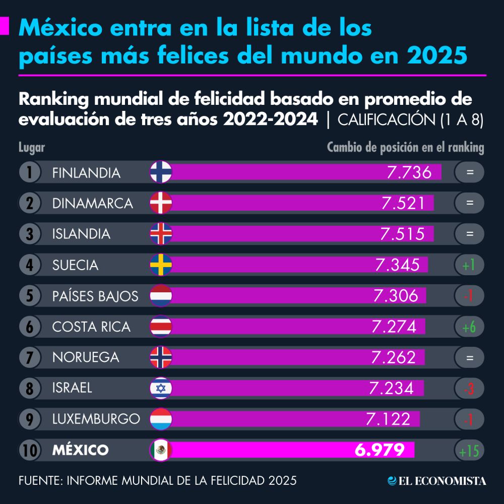 México es el décimo país más feliz del mundo, de acuerdo con el Informe Mundial de la Felicidad 2025 coordinado por la Universidad de Oxford, Gallup y la Red de Soluciones para el Desarrollo Sostenible (SDSN) de la ONU.