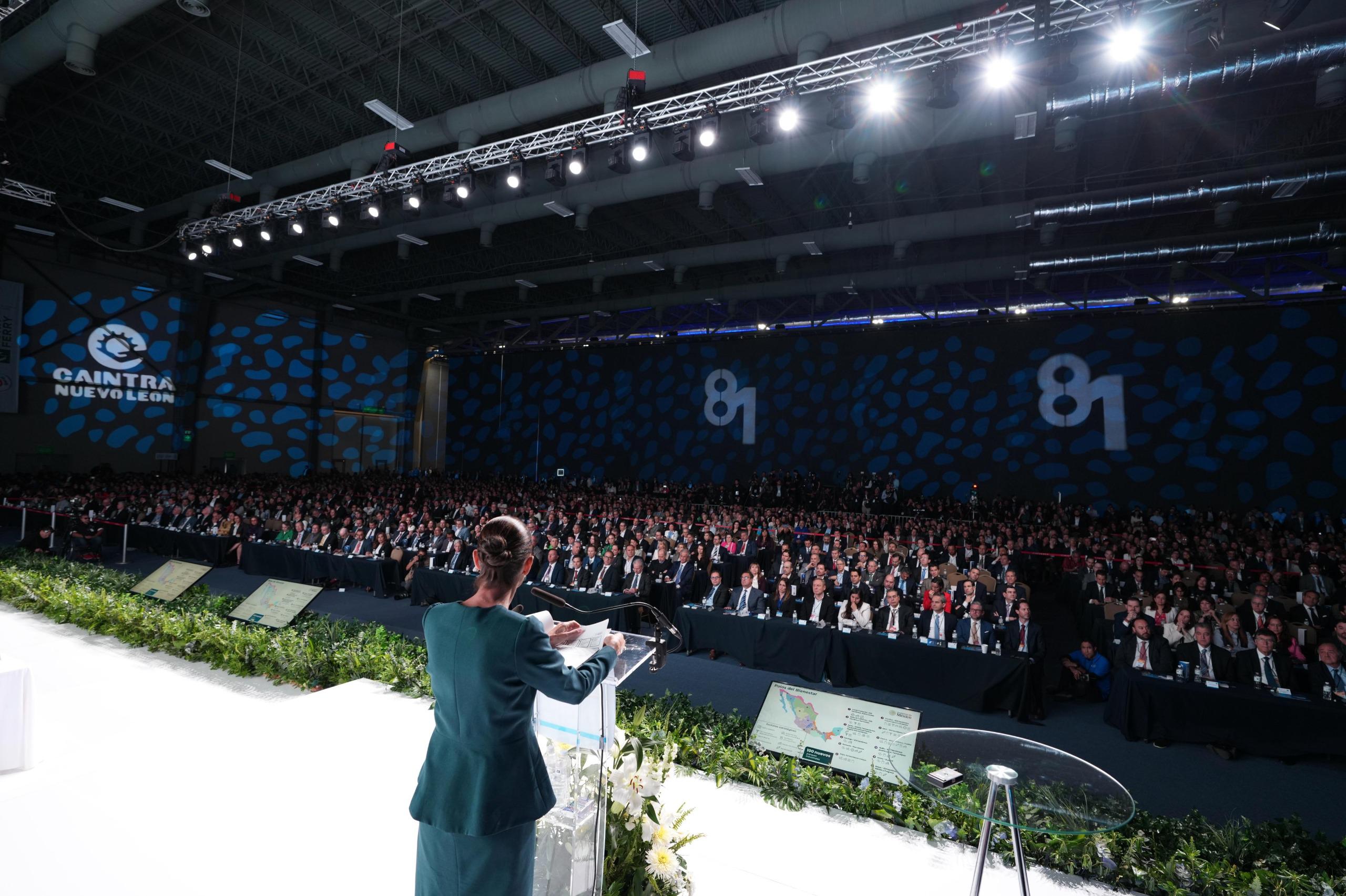 Monterrey, Nuevo León a 20 de marzo de 2025.- Durante la 81 Asamblea Anual de la Cámara de la Industria de Transformación (CAINTRA) Nuevo León, la Presidenta Claudia Sheinbaum Pardo, resaltó que México tiene una economía fuerte ya que se impulsa la inversión pública y privada con certidumbre jurídica, por lo que invitó a las y los empresarios a fortalecer el Plan México.