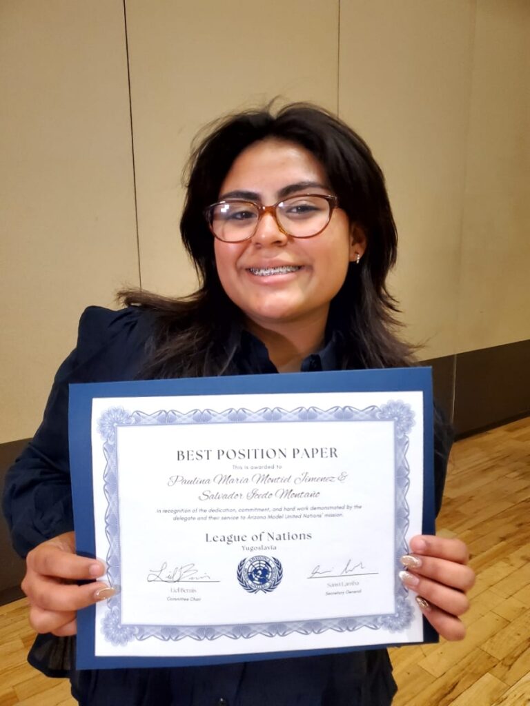 Hermosillo, Sonora; 27 de marzo de 2025.- Por su destacada participación, los alumnos del Colegio de Bachilleres del Estado de Sonora (Cobach), Paulina María Montiel Jiménez y Salvador Icedo Montaño, recibieron el reconocimiento al Mejor Ensayo de Postura en la 63.ª edición de la Conferencia Anual del Modelo de Naciones Unidas en la Universidad de Arizona (AzMUN, por sus siglas en inglés).