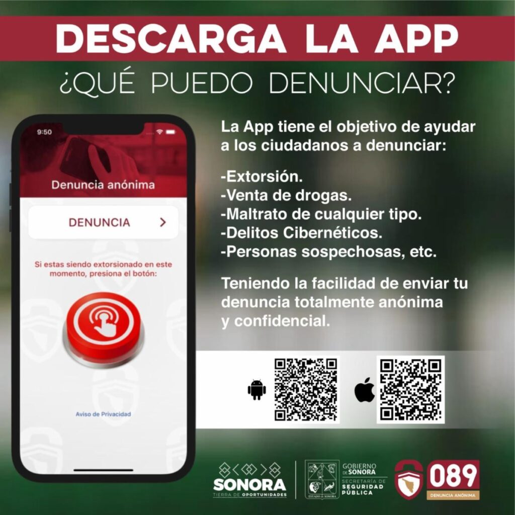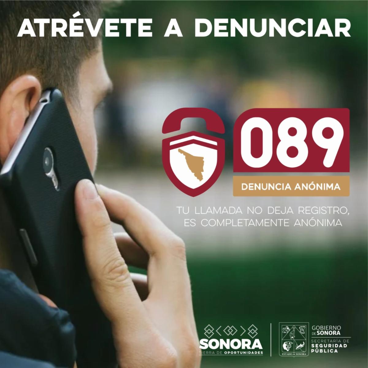 La Secretaría de Seguridad Pública añadió que el Gobierno de Sonora pone a disposición de la ciudadanía dos vías para denunciar posibles delitos de forma anónima y confiable: la línea 089 y la app 089 Sonora, disponible en la tienda de aplicaciones de preferencia, con descarga rápida y gratuita.