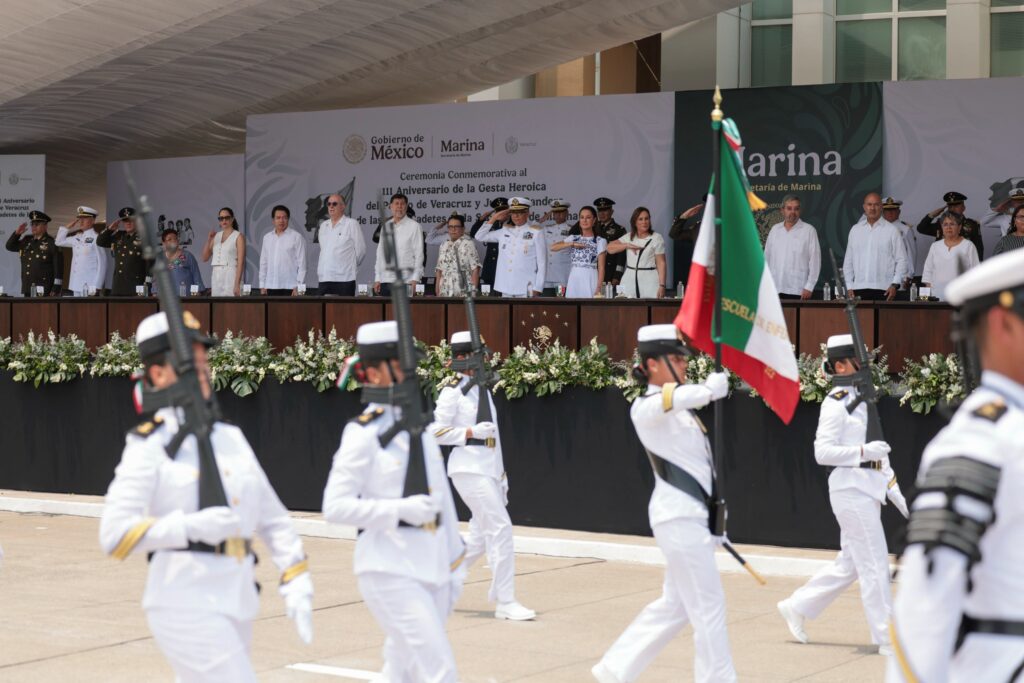 “Hasta ahora ha habido una relación de respeto y estoy segura, confío en que se mantenga esta política de buena vecindad”, resaltó en la Ceremonia de Jura de Bandera de 418 Cadetes de Primer Año de la Heroica Escuela Naval Militar y del Centro de Estudios Navales en Ciencias de la Salud, conformado por la Escuela Médico Naval y Escuela de Enfermería Naval, en Antón Lizardo, Veracruz.