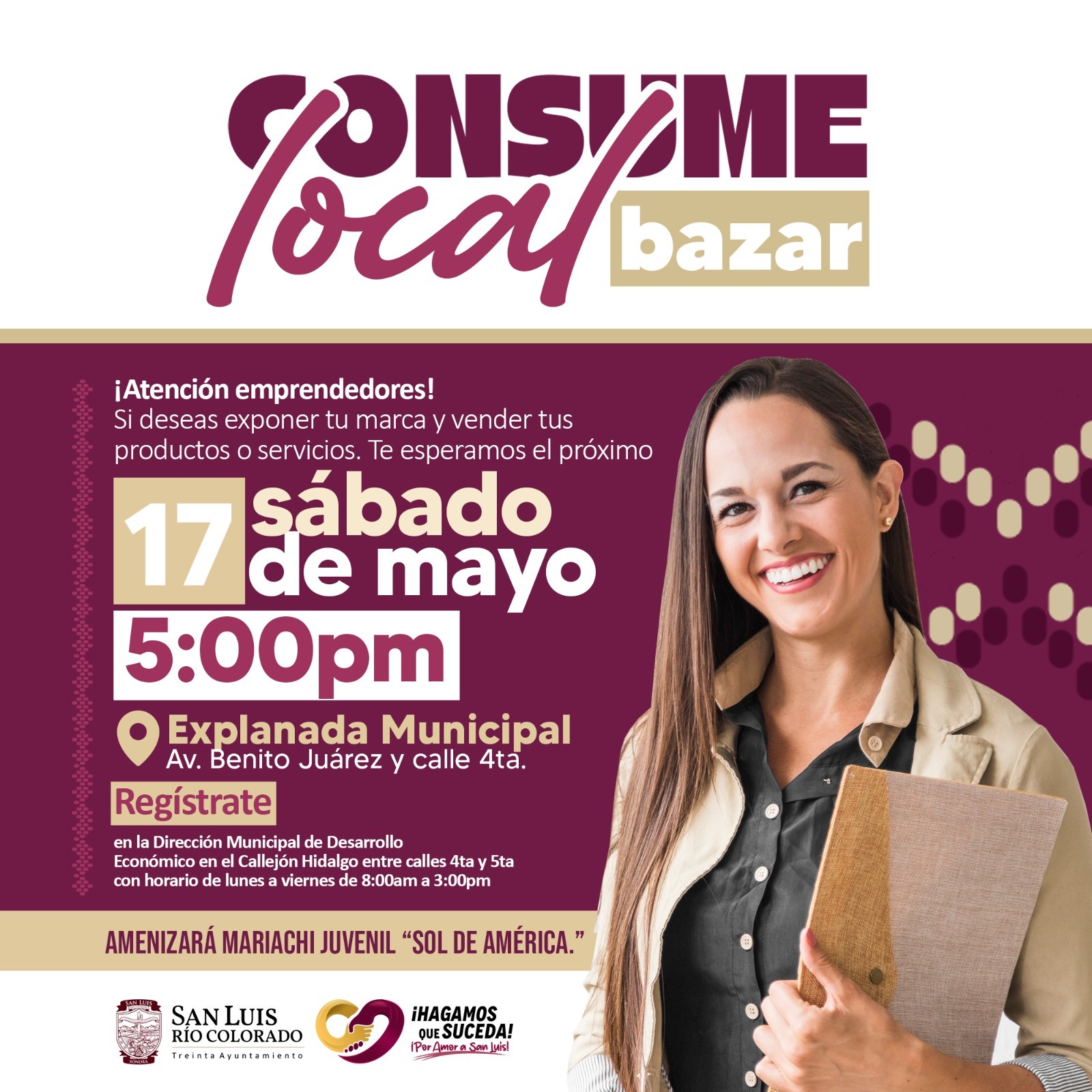 San Luis Río Colorado, Sonora (Abril 24 de 2025).- Con la finalidad de brindar un espacio a emprendedores para dar a conocer sus productos, el 30 Ayuntamiento, a través de la Dirección de Desarrollo Económico, invita a participar en la 2da edición del “Bazar Emprendedor”, que se llevará a cabo el sábado 17 de mayo en la Explanada Benito Juárez.