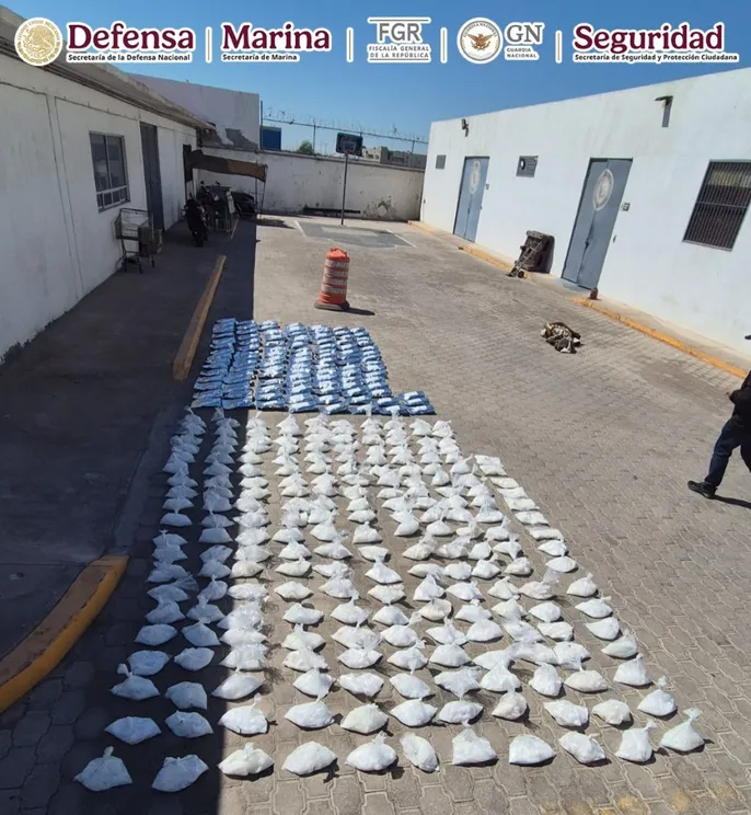 Luego de un registro minucioso, los agentes de seguridad hallaron 324 bolsas de metanfetamina, de las cuales 216 eran de plástico y 108 tenían un recubrimiento plateado, mismas que estaban ocultas debajo de unos colchones ubicados en la parte trasera de la unidad.