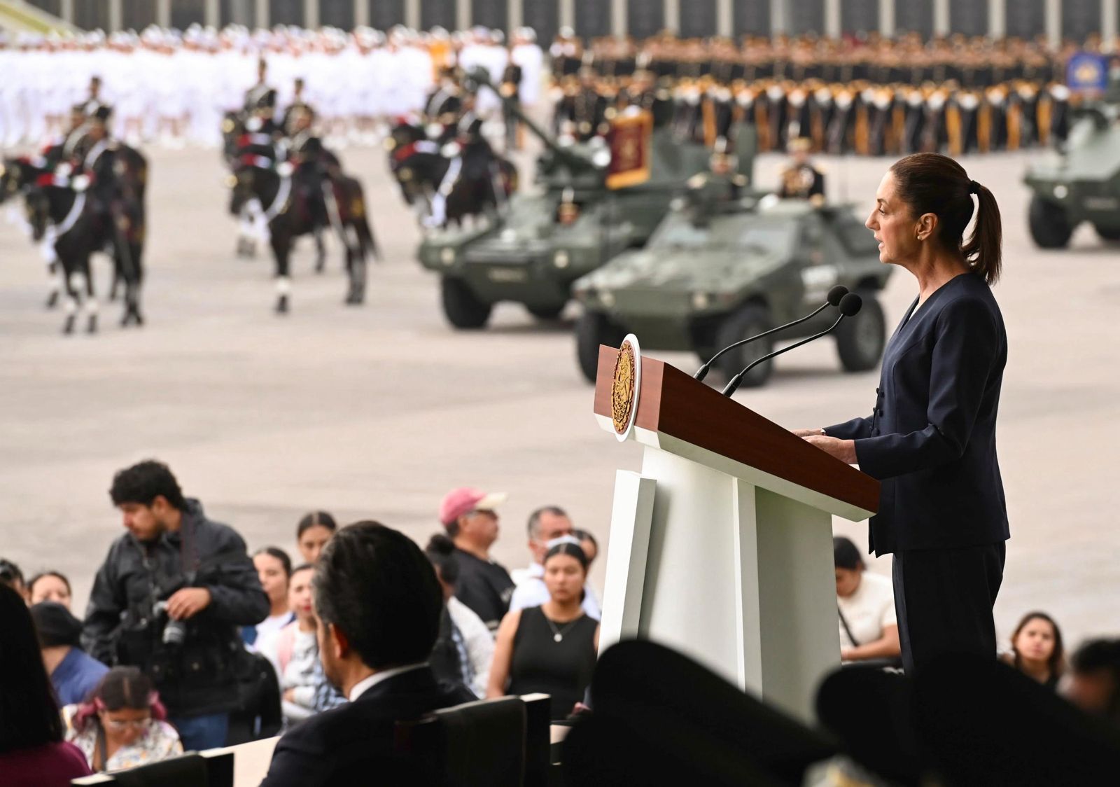 “Hoy, 9 de mayo de 2025, hago un homenaje a las y los cadetes de antes y de ahora, a las y los soldados, oficiales, de antes y de ahora. Hago un homenaje a las Fuerzas Armadas. Hago un homenaje a ustedes, a sus familias. Y agradezco eternamente su disciplina, su honor, su valor, su valentía y su lealtad. Gracias, General secretario, Ricardo Trevilla Trejo; gracias, almirante secretario Raymundo Predo Morales Ángeles; por su entrega y acompañamiento”, señaló.