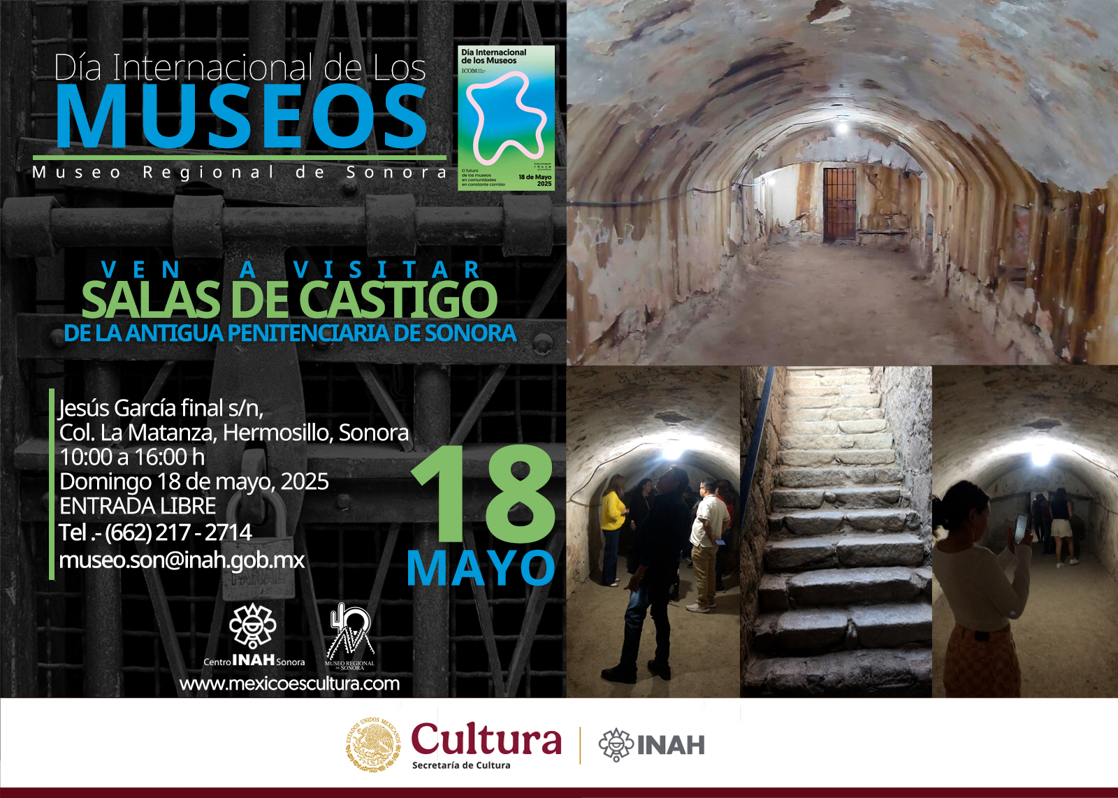 La invitación a conocer las celdas de castigo, está dirigida a todo público de manera presencial el próximodomingo 18 de mayo, en horario de 10:00 a 16:00 horasde Sonora, para visitar las celdas de castigo en las instalaciones del Museo Regional de Sonora, Antigua Penitenciaria (Calle Jesús García final s/n. Col. La Matanza)