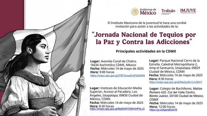 Ciudad de México, a 13 de mayo de 2025.- El Instituto Mexicano de la Juventud (IMJUVE) convoca a las y los jóvenes de las 32 entidades federativas a participar en la «Jornada Nacional de Tequios por la Paz y contra las Adicciones», que se realizará este 14 de mayo como parte de la estrategia nacional “Por la Paz y Contra las Adicciones” que impulsa el Gobierno de México.