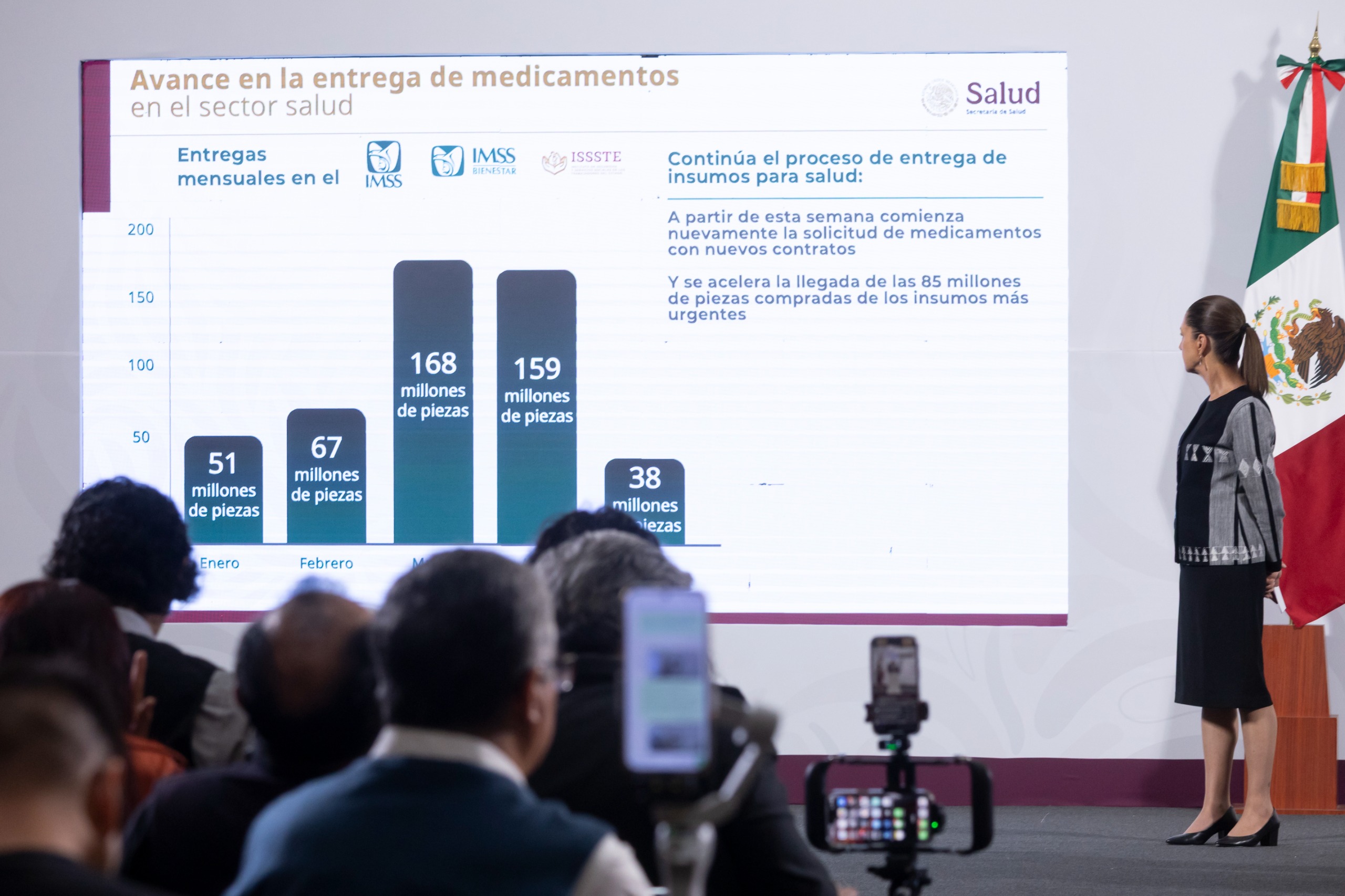 El subsecretario de Integración y Desarrollo del Sector Salud, Eduardo Clark García Dobarganes, informó que en los primeros días del mes de mayo se han recibido 38 millones de medicamentos e insumos médicos, las cuales se suman a las 51 millones de piezas que se entregaron en enero; 67 millones de febrero; 168 millones en marzo y 159 millones de piezas en abril.