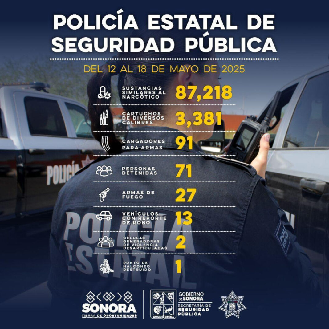Hermosillo, Sonora; 19 de mayo de 2025.- En una semana de trabajo coordinado para la prevención y combate al delito en Sonora, la Secretaría de Seguridad Pública (SSP) realizó el aseguramiento de armas de fuego, sustancias ilícitas y la detención de personas por flagrancia delictiva.