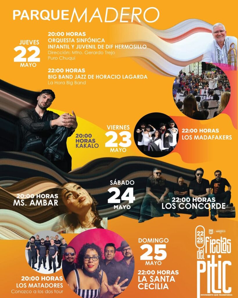 -En el Foro Parque Madero estará la Orquesta Sinfónica Infantil y Juvenil de DIF Hermosillo, bajo la dirección de Gerardo Trejo; Big Band Jazz de Horario Lagarda; Los Madafakers; Mr Ambar; Los Concorde; Los Matadores; y La Santa Cecilia.