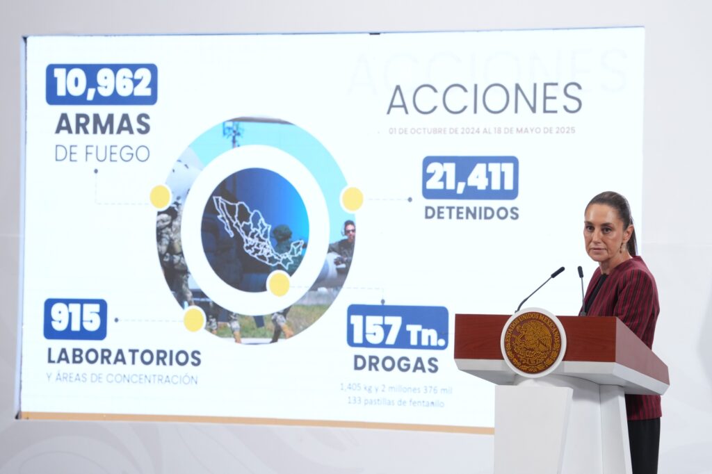 Ciudad de México, 20 de mayo de 2025.- La Presidenta Claudia Sheinbaum Pardo resaltó que gracias al trabajo permanente, cotidiano y coordinado del Gabinete de Seguridad del Gobierno de México, en conjunto con los estados, del 1 de octubre de 2024 al 18 de mayo de 2025, se han incautado 10 mil 962 armas de fuego y 157 toneladas de droga, se han destruido 915 laboratorios y se han detenido a 21 mil 411 personas por delitos de alto impacto.