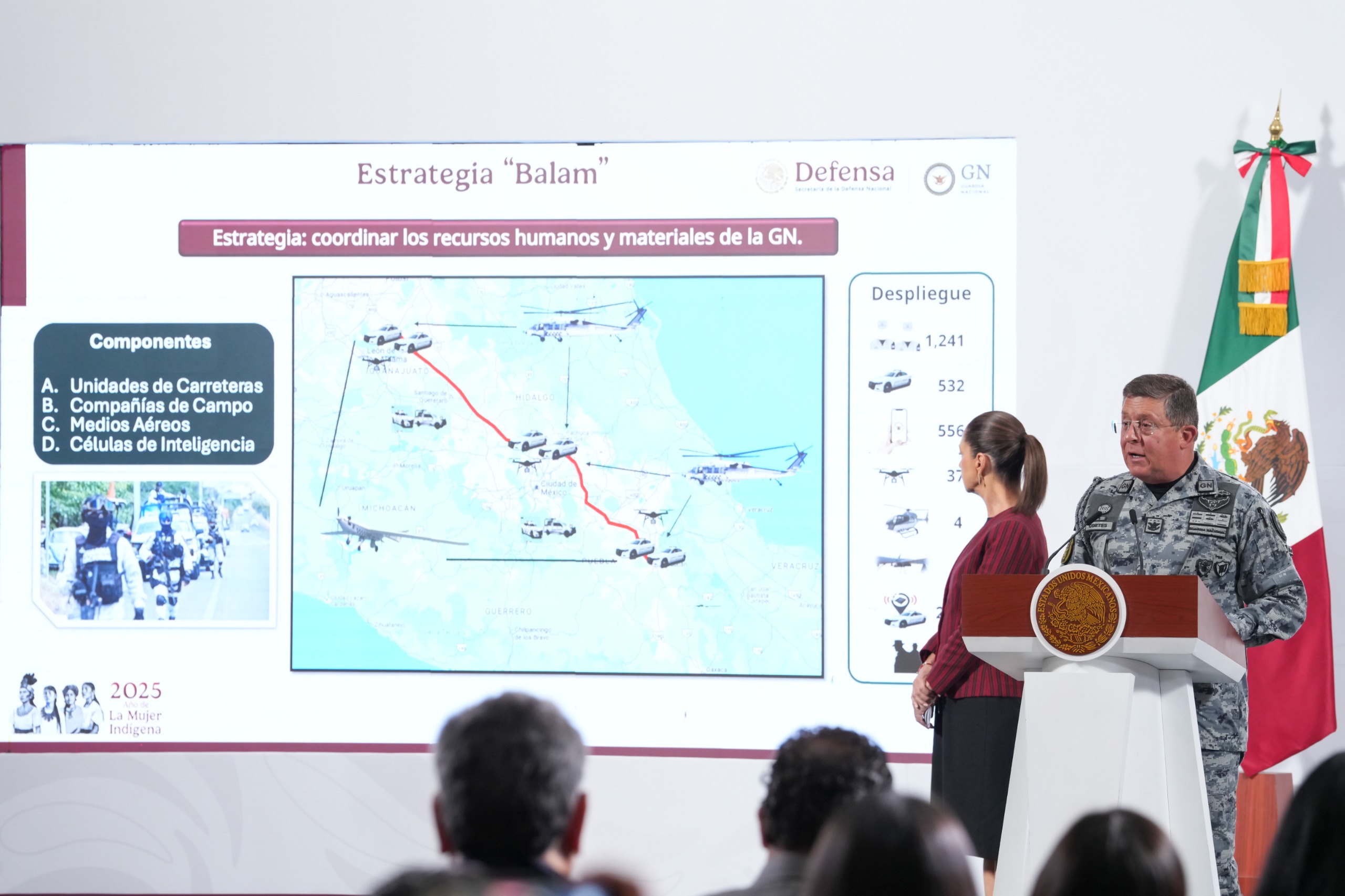 El comandante de la Guardia Nacional, Hernán Cortés Hernández, detalló que con la estrategia Balam, en siete meses, el robo a transporte de carga ha reducido en un 28 por ciento y se ha incrementado en 24 por ciento la recuperación de vehículos, gracias a que se desplegaron mil 241 efectivos; 532 vehículos, 37 drones, cuatro helicópteros, dos aeronaves no tripuladas y 23 células de investigación en 12 estados de la República y 22 tramos carreteros que concentran el 80 por ciento de los casos de este delito. Destacó que adicionalmente en la vía Ciudad de México-Puebla se aplica la operación Río Frío con 164 efectivos, 36 vehículos, dos aeronaves no tripuladas y seis células de investigación. Además, como parte de las acciones para reactivar el puerto de Acapulco, la Guardia Nacional, a partir del 6 de mayo, desplegó en la zona costera al 52 Batallón de Protección al Turismo que cuenta con mil 21 efectivos, 160 vehículos, seis lanchas zodiac, dos binomios caninos, para realizar acciones de aproximación, patrullaje en playas, módulos de atención, vigilancia en transporte público y más.