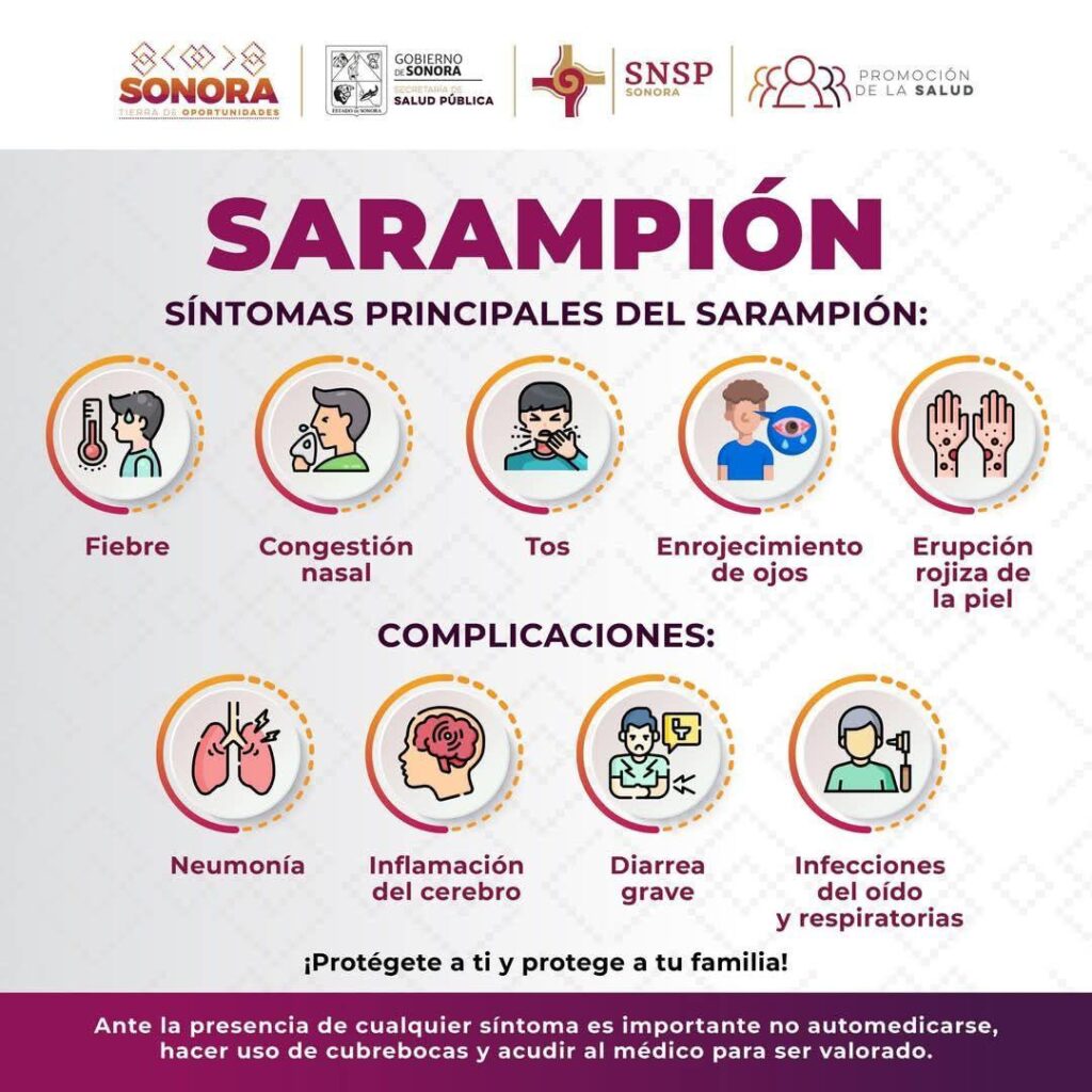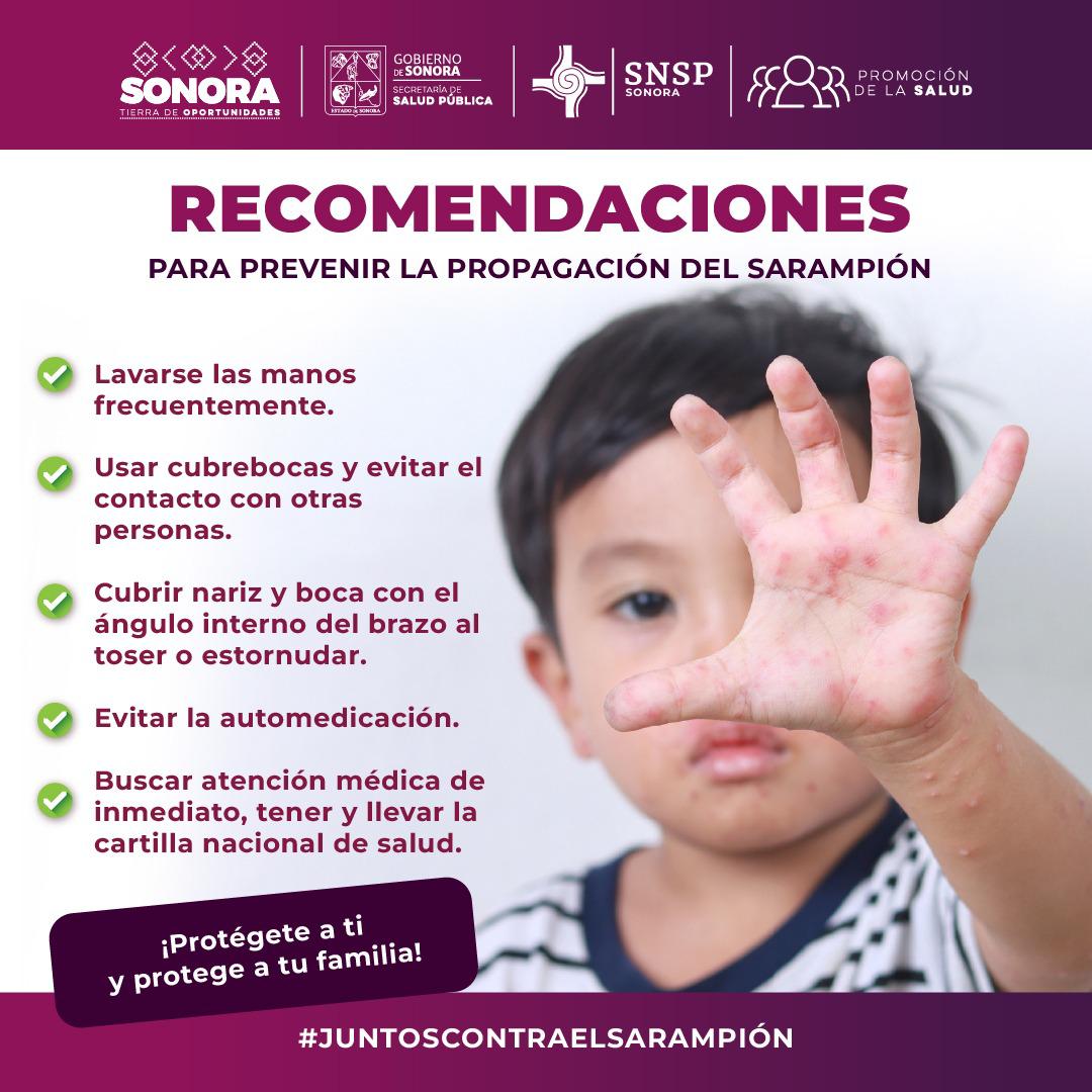 Cabe destacar que, por disposición federal, en los municipios de Sonora donde se han presentado casos confirmados de la enfermedad, se vacunará contra el sarampión a las personas de entre 7 y 49 años de edad que no cuenten con la vacuna o no recuerden si se la aplicaron