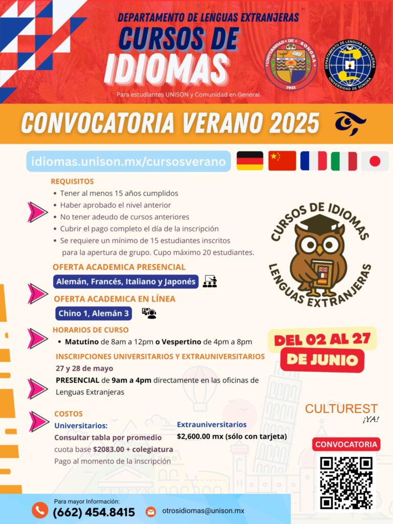 La Universidad de Sonora, a través del Departamento de Lenguas Extranjeras, abrió la convocatoria para los Cursos Intensivos de Verano 2025 de inglés y otros cinco idiomas: alemán, francés, italiano, japonés y chino.