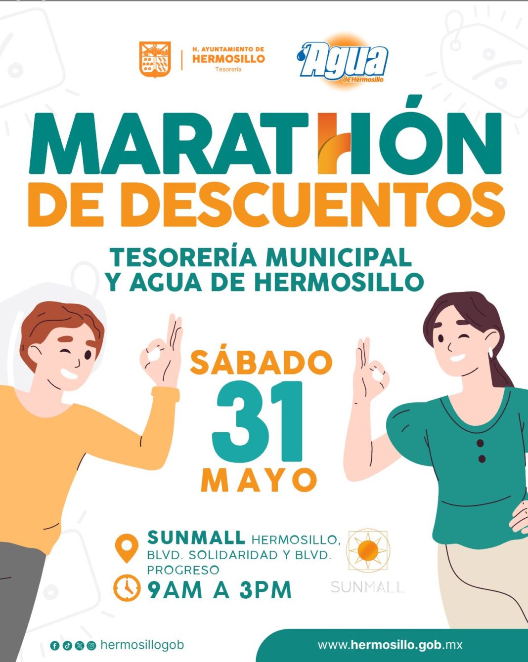 Hermosillo, Sonora; 29 de mayo, 2025.- Tesorería Municipal invita a aprovechar los beneficios del “Doble Marathón de Descuentos” del Ayuntamiento de Hermosillo que se realizará este sábado 31 de mayo en SunMall de bulevar Progreso y Centro de Atención Veracruz de la colonia San Benito.