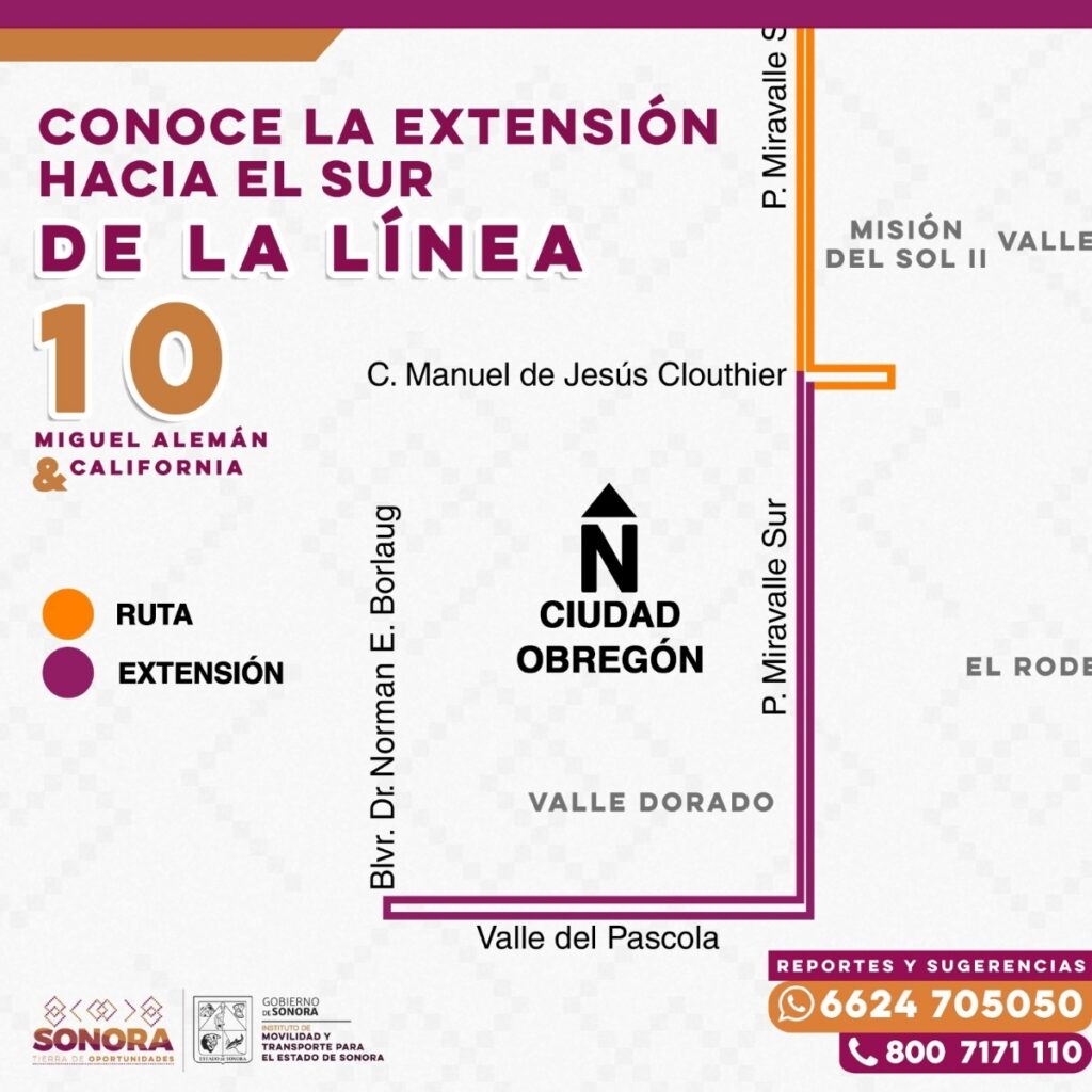 Líneas 10 Miguel Alemán y 10 California: Se amplía la cobertura en ambas rutas, con servicio en la parte centro y sur de las colonias Valle Dorado y Villa Fontana. Las unidades en circulación aumentan de 20 a 24, lo que reduce los tiempos de espera de 8 a 6 minutos.