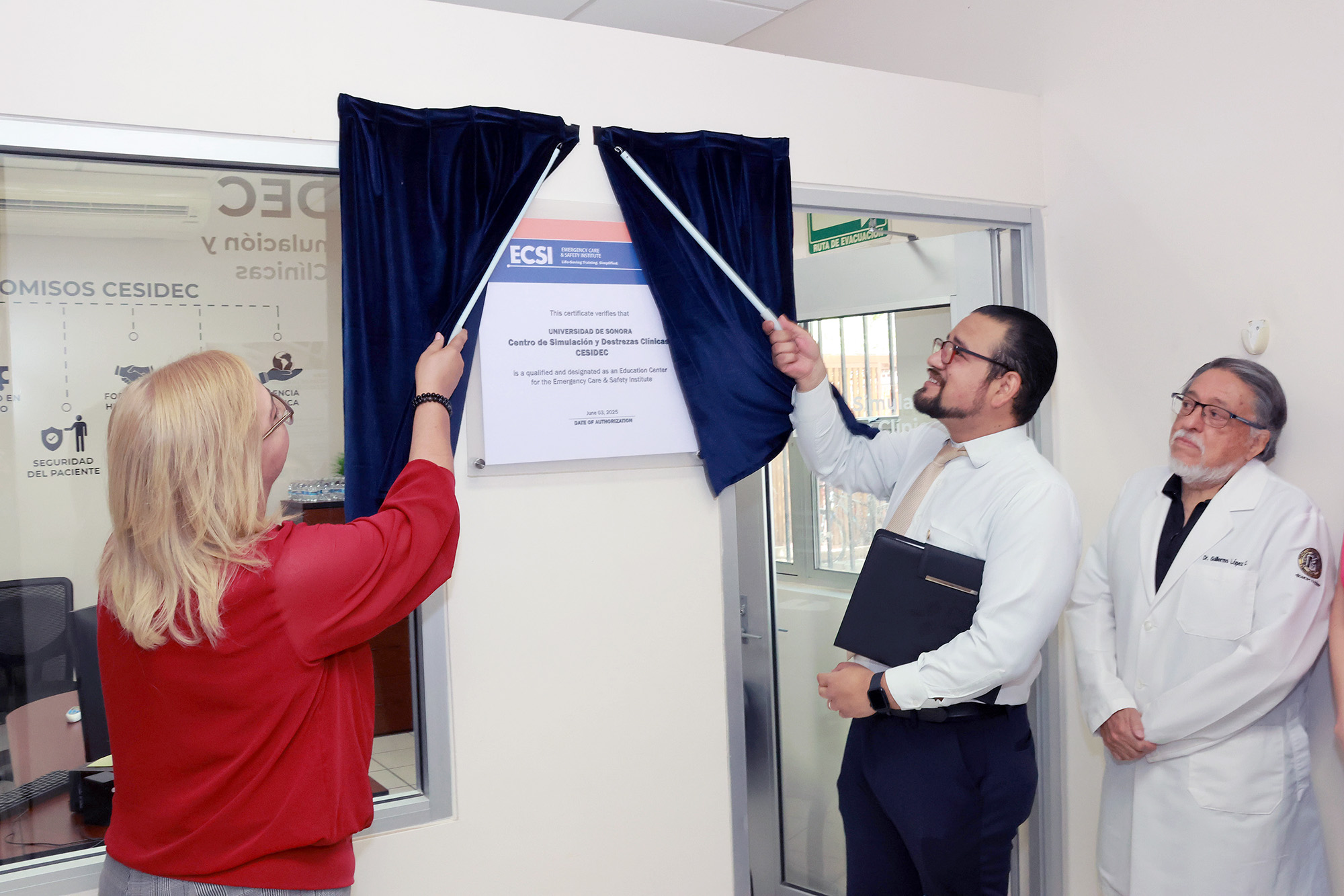 En ceremonia que reunió a presidentes de academias y personal del sector salud, la rectora María Rita Plancarte Martínez, develó la placa alusiva a la certificación del Centro de Simulación y Destrezas Clínicas de la Universidad de Sonora, ubicado en el Departamento de Medicina y Ciencias de la Salud, como sede educativa del Emergency Care & Safety Institute (ECSI).