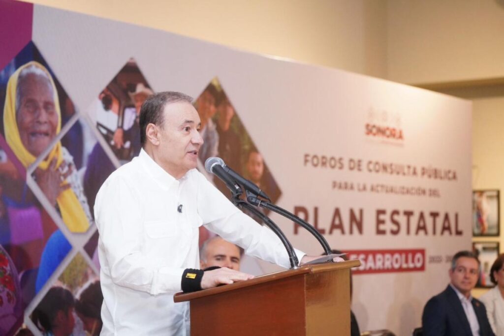 –El mandatario sonorense puso en marcha los foros de consulta pública para actualizar el Plan Estatal de Desarrollo 2022-2027, con el objetivo de alinear los proyectos y políticas del Gobierno de Sonora con el Plan Nacional de Desarrollo 2025-2030, impulsado por la presidenta Claudia Sheinbaum Pardo.