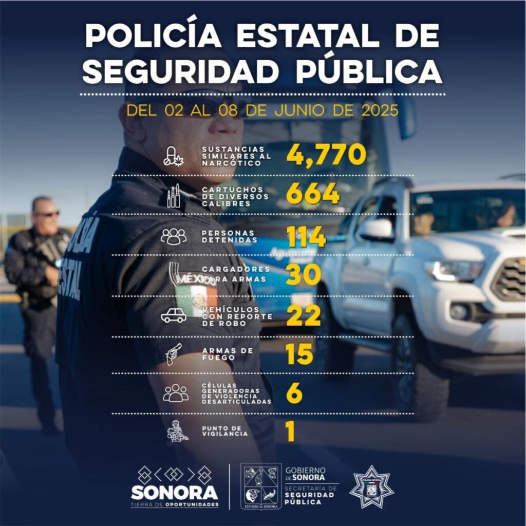 Hermosillo, Sonora; 9 de junio de 2025.- Durante la estrategia de seguridad en municipios, el Gobierno de Sonora, a través de la Secretaría de Seguridad Pública (SSP), realizó operativos, generando la detención de 114 personas, entre estas seis células generadoras de violencia, un punto de vigilancia, además del aseguramiento de narcótico, armas y vehículos robados.