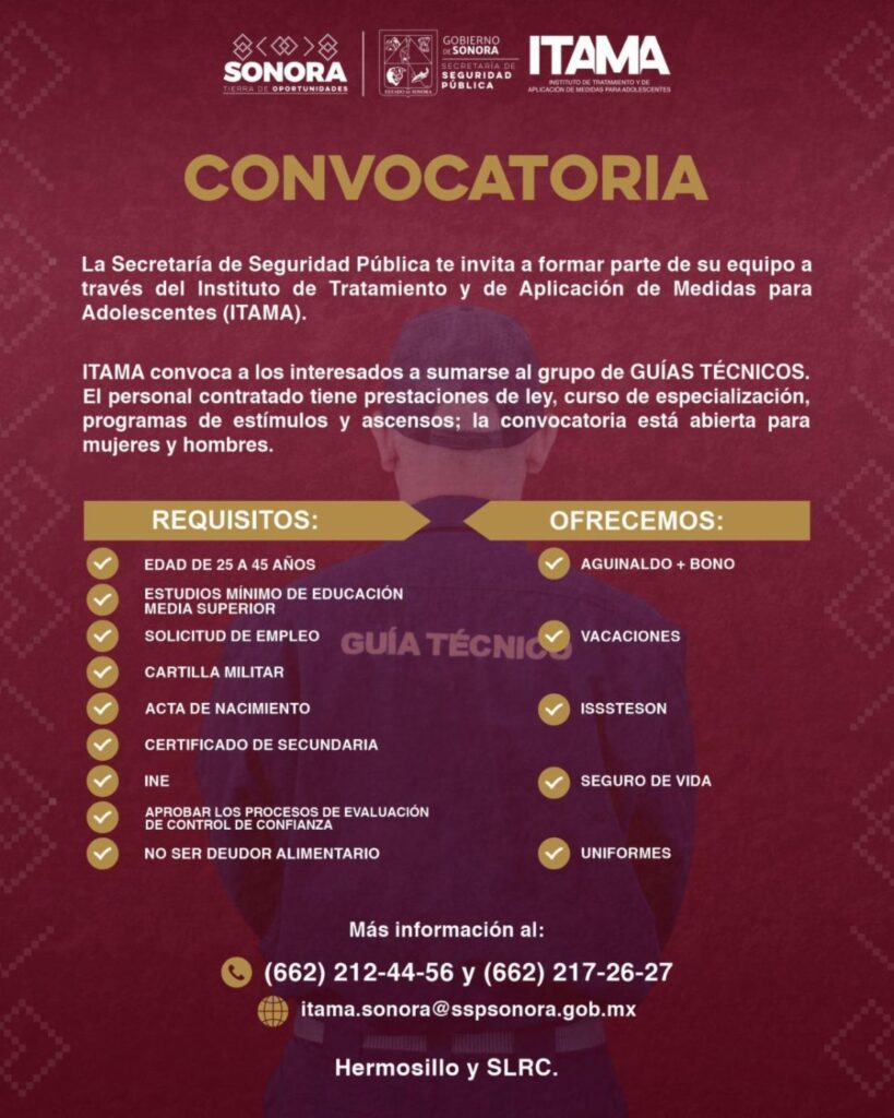 Hermosillo, Sonora; 13 de junio de 2025.- El Gobierno de Sonora convoca a mujeres y hombres para desempeñar funciones de seguridad como Guía Técnico al interior de los centros de internamiento del Instituto de Tratamiento y de Aplicación de Medidas para Adolescentes (ITAMA), localizados en Hermosillo y San Luis Río Colorado.