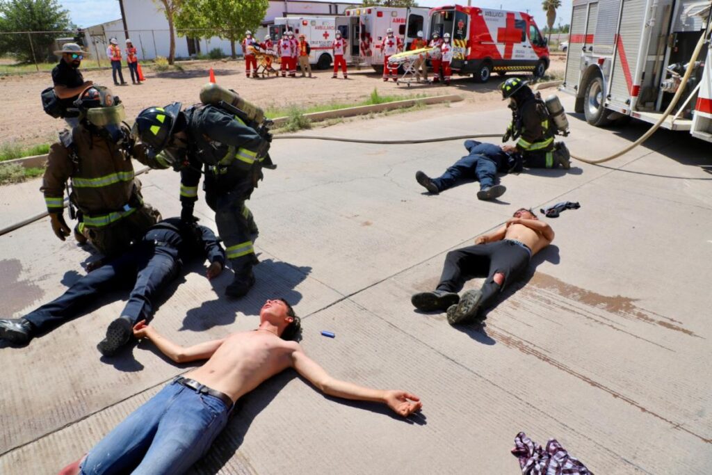 Este ejercicio, catalogado como Simulacro Mayor por Fuga de Gas Cloro, se desarrolló en la ciudad fronteriza de Agua Prieta con la participación de cuerpos de emergencia y rescate de ambos países.