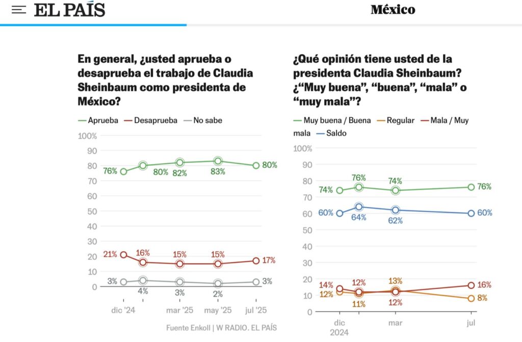 La popularidad de la presidenta Claudia Sheinbaum permanece en niveles muy altos después de 10 meses de gobierno en los que se viene navegando entre olas encrespadas, tanto en los asuntos exteriores como en política interna las últimas semanas. Una encuesta de Enkoll para EL PAÍS y W Radio, levantada entre el 19 y el 22 de este mes con entrevistas personales en viviendas, revela que la aceptación de la mandataria ha caído tres puntos desde el pasado mayo, pero todavía se sitúa en un muy elevado 80% de la ciudadanía que valora su trabajo. Una percepción similar a la que tenía en enero. “La caída de tres puntos se debe al desgaste propio de una persona en el gobierno, pero todo indica que su aceptación se ha estabilizado y quizá sea difícil que vuelva a alcanzar el pico del 83%”, interpreta Heidi Osuna, directora de la encuestadora. “Los mexicanos parece estar descansando de la política ahora, después de las recientes elecciones, pero su saldo de opinión no varía”, afirma.