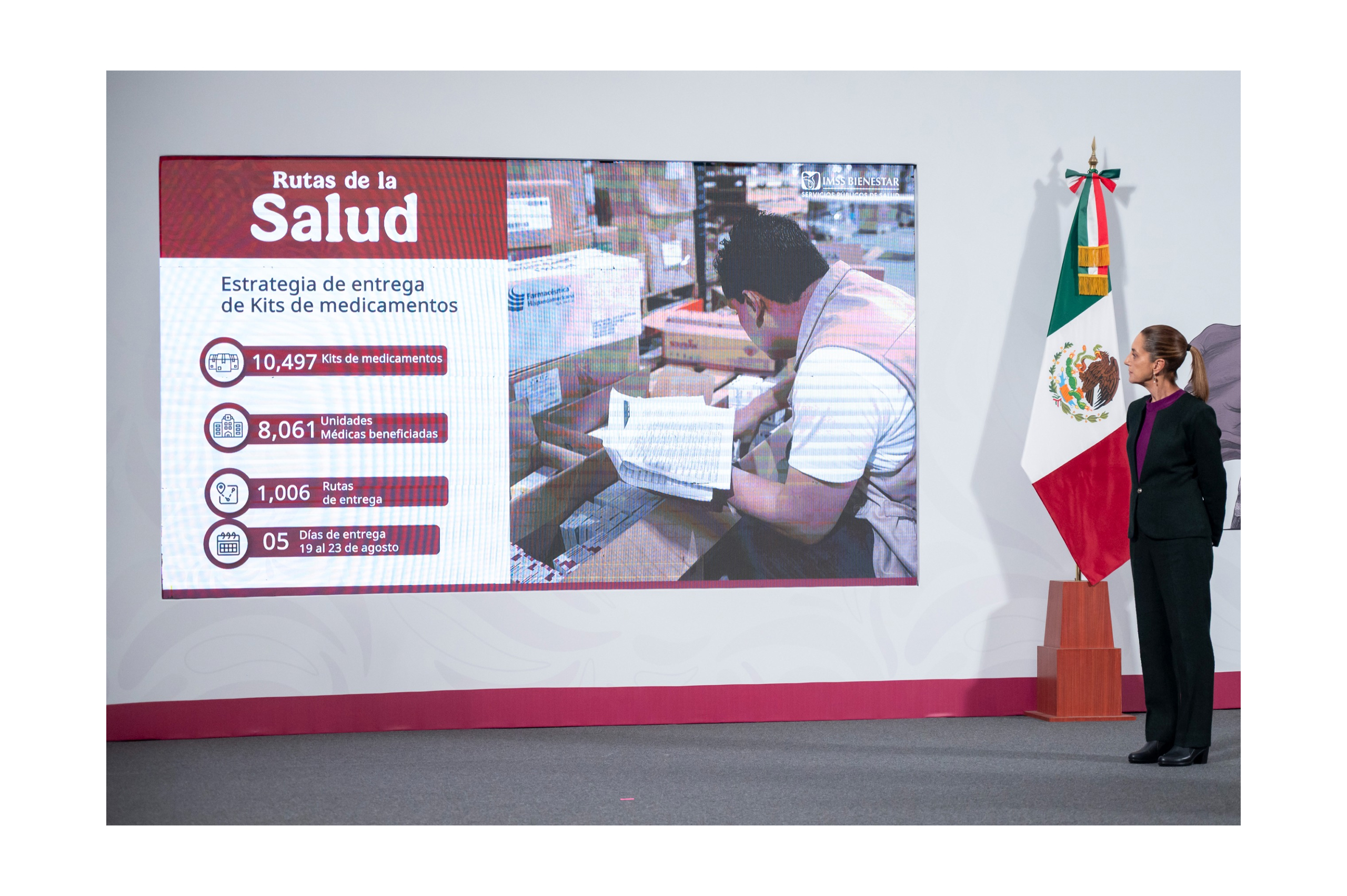 Ciudad de México, 19 agosto de 2025.- La Presidenta de México Claudia Sheinbaum Pardo encabezó la puesta en marcha de las Rutas de la Salud, un nuevo mecanismo de distribución de medicamentos que, en su primera semana, entregará 15 millones de piezas de 147 tipos de medicamentos e insumos médicos de primer nivel para las 8 mil 61 Unidades Médicas del IMSS Bienestar en los 23 estados federalizados.
