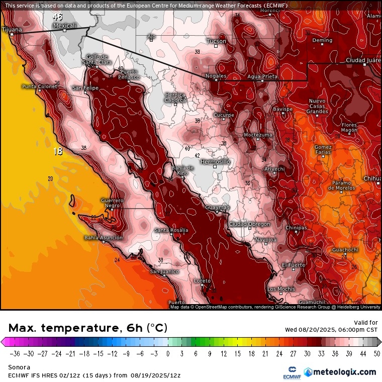 - Se esperan valores de 43 a 45 grados a la sombra, sobre todo en la región central de Sonora durante esta semana