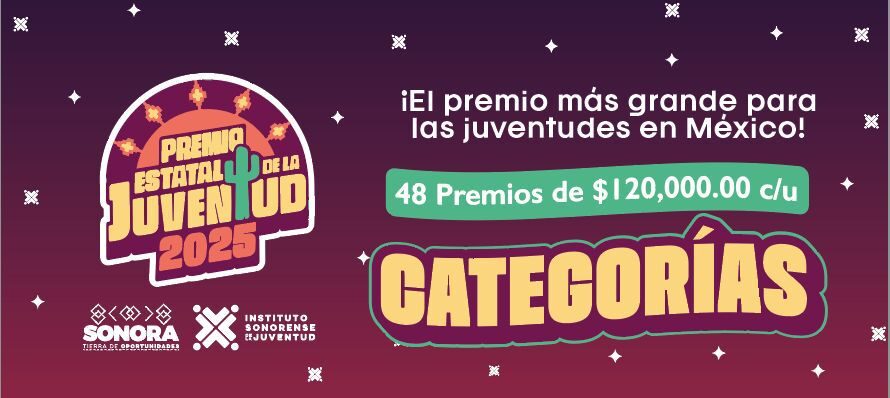 Hermosillo, Sonora; 20 de agosto de 2025.- El Gobierno de Sonora, a través del Instituto Sonorense de la Juventud (ISJ), invita a participar en el Premio Estatal de la Juventud (PEJ) 2025, el mayor reconocimiento a nivel nacional para destacar el talento, esfuerzo y compromiso de las juventudes sonorenses.