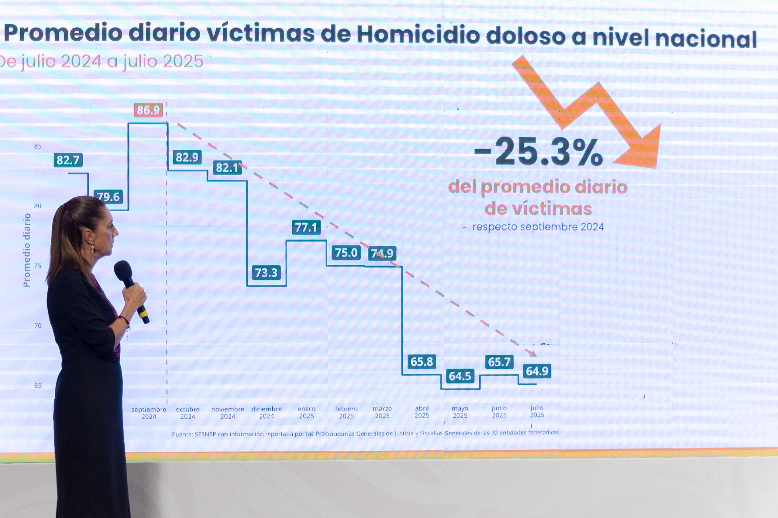 La Presidenta Claudia Sheinbaum Pardo recordó que el objetivo del Gobierno de México es la seguridad y la paz del país, lo cual se construye a través de un verdadero sistema de justicia y con la implementación de los cuatro ejes de la Estrategia Nacional de Seguridad, que a la fecha han permitido reducir en 25 por ciento el homicidio doloso.