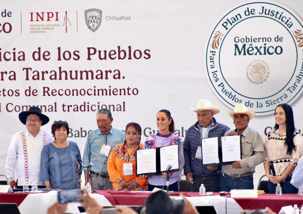 En este marco, la presidenta destacó el reconocimiento de posesión legítima, resarcimiento, restitución y titulación de propiedad comunal tradicional de tierras, “firmamos 5 decretos presidenciales que restituyen, reconocen y titulan cerca de 10 mil hectáreas de tierras como propiedad comunal tradicional para las comunidades Rarámuri y Wixárika con lo que se reconocen sus derechos históricos sobre los territorios que habitan y preservan”, detalló.
