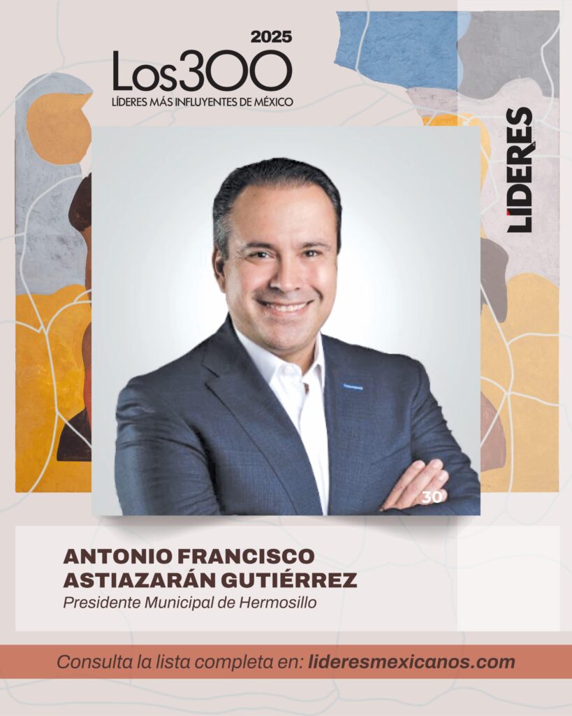 Hermosillo, Sonora; 7 de septiembre de 2025.- El presidente municipal de Hermosillo, Antonio “Toño” Astiazarán Gutiérrez, es reconocido como uno de los 300 Líderes Más Influyentes en México, en la categoría “Poder Ejecutivo”, por la revista «Líderes Mexicanos» que desde 2001 realiza esta selección de mexicanos que más impactan en nuestro país.