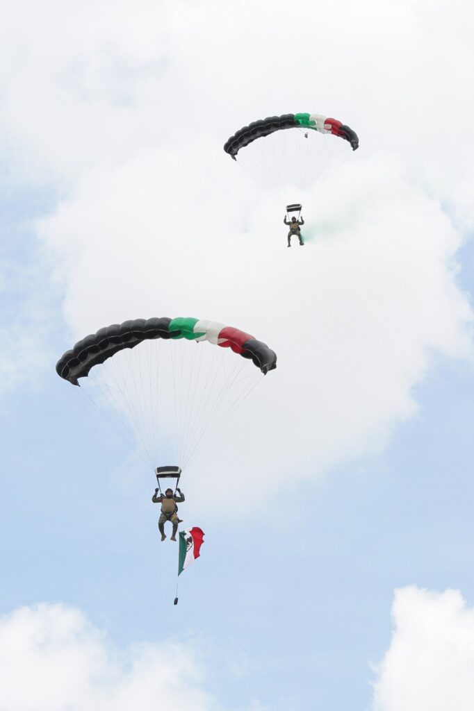 Como parte del Desfile Cívico Militar, siete paracaidistas: cinco del Ejército mexicano y dos de la Secretaría de Marina, realizaron un salto libre acrobático. Y la teniente Jenny Concepción Bolaños Sánchez, perteneciente a la Guardia Nacional, fue la encargada de declamar la poesía “A la Patria”, de la autoría del poeta Manuel Acuña.