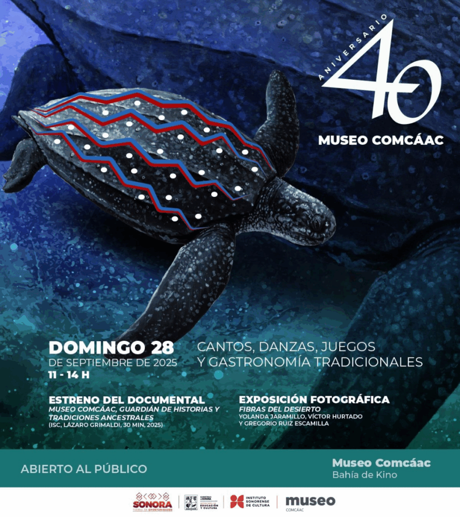 Hermosillo, Sonora; 24 de septiembre de 2025.– El Gobierno de Sonora, a través de la Secretaría de Educación y Cultura (SEC) y el Instituto Sonorense de Cultura (ISC), invita a la comunidad a ser parte de la celebración del 40 aniversario del Museo Comcáac en Bahía de Kino. Este domingo 28 de septiembre, el museo abrirá sus puertas a las 11:00 horas para una jornada única.