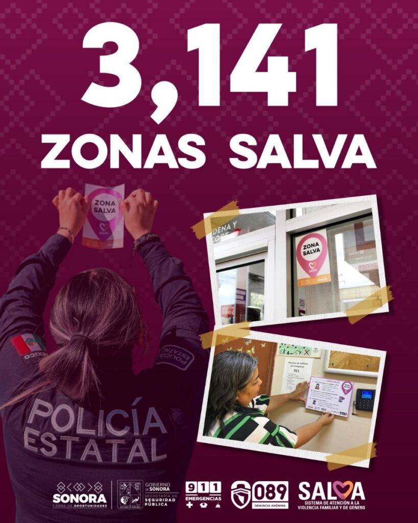 La Secretaría de Seguridad Pública (SSP) Sonora informó que, a la fecha, existen tres mil 141 Zonas SALVA distribuidas en los 72 municipios, de las cuales 143 se encuentran en Empalme. Estos espacios incluyen comercios, oficinas e instituciones que prestan sus instalaciones como lugares seguros para albergar a posibles víctimas de violencia familiar y de género.