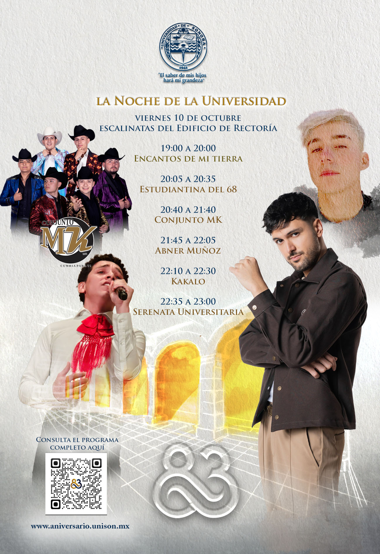 A las 23:00 horas, los asistentes se unirán a la entonación de las tradicionales Mañanitas a la Universidad de Sonora, interpretadas por estudiantes y músicos invitados, como símbolo de unión, identidad y orgullo compartido entre quienes forman parte de esta gran comunidad universitaria.