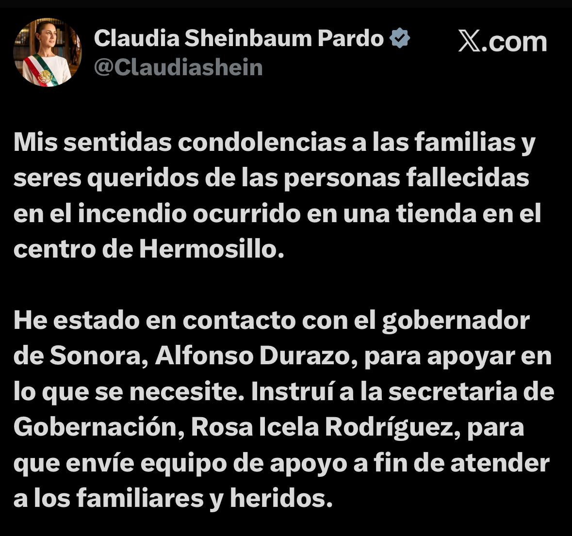 “Mis sentidas condolencias a las familias y seres queridos de las personas fallecidas en el incendio ocurrido en una tienda en el centro de Hermosillo”.