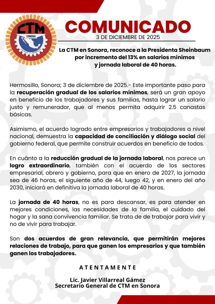 Hermosillo, Sonora; 3 de diciembre de 2025.- Este importante paso para la recuperación gradual de los salarios mínimos, será un gran apoyo en beneficio de los trabajadores y sus familias, hasta lograr un salario justo y remunerador, que al menos permita adquirir 2.5 canastas básicas.