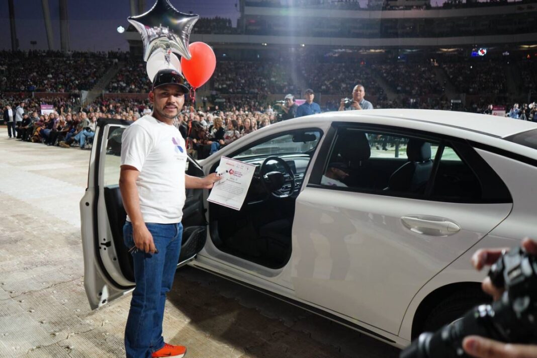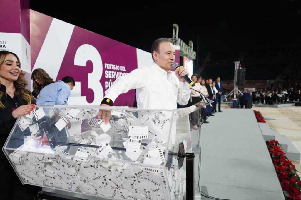 En el marco de la celebración, el gobernador Alfonso Durazo realizó la rifa de regalos y la entrega de casas y automóviles.