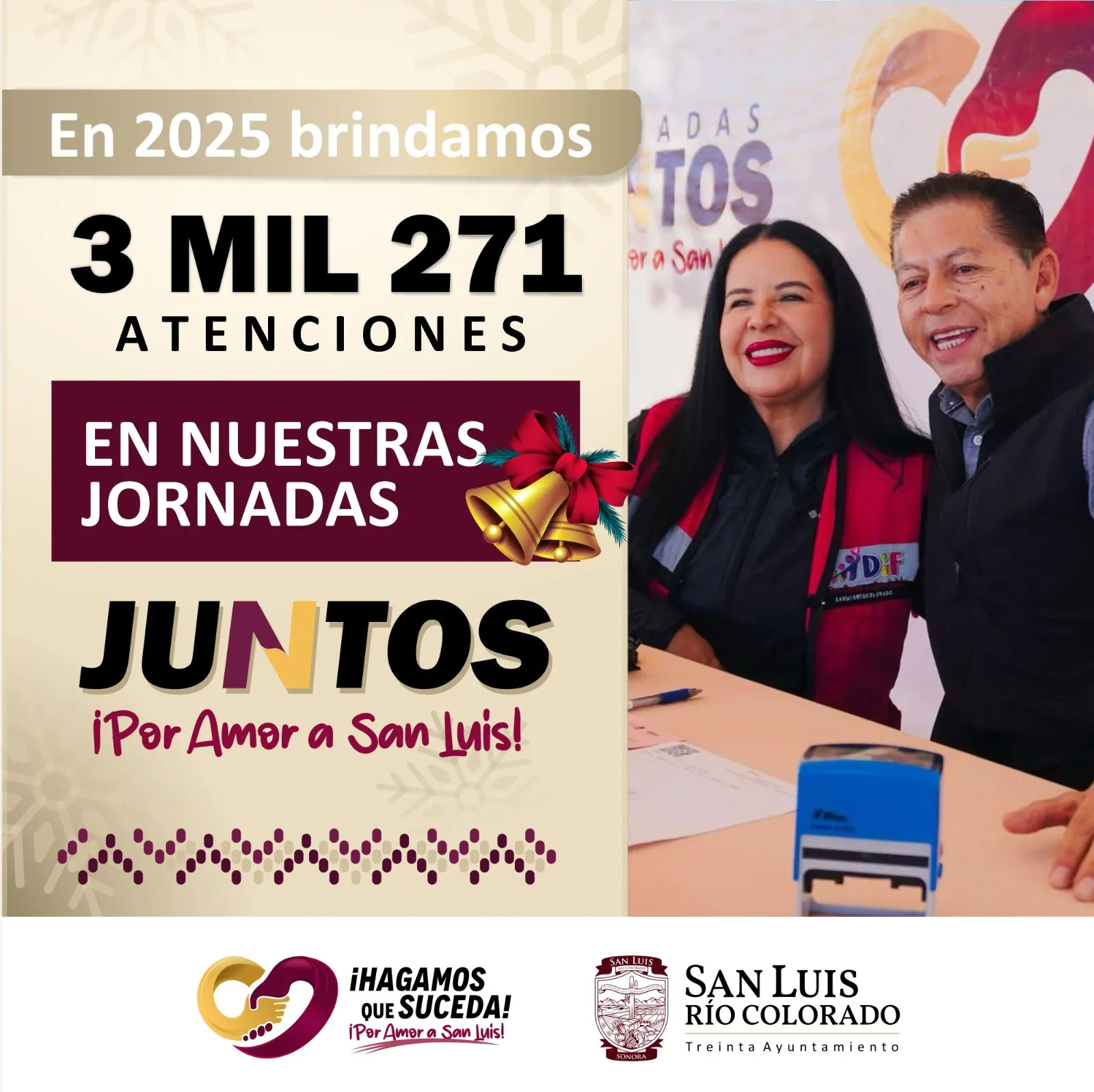 San Luis Río Colorado, Sonora (Diciembre 31 de 2025).- De manera cercana y directa, durante este 2025 el 30 Ayuntamiento atendió a 3 mil 271 sanluisinas y sanluisinos por medio de las jornadas comunitarias “Juntos Por Amor a San Luis”, brindando apoyo, orientación y diversos servicios a quienes más lo necesitan.
