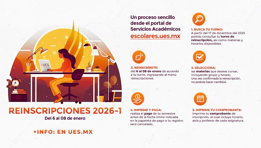 Quienes aspiren a integrarse por primera vez a la UES podrán consultar la Convocatoria de Nuevo Ingreso 2026 a finales de febrero en https://aspirantes.ues.mx/; en tanto que la información paso a paso sobre las reinscripciones se encuentra disponible en ues.sonora.edu.mx/alumnos/reinscripciones.
