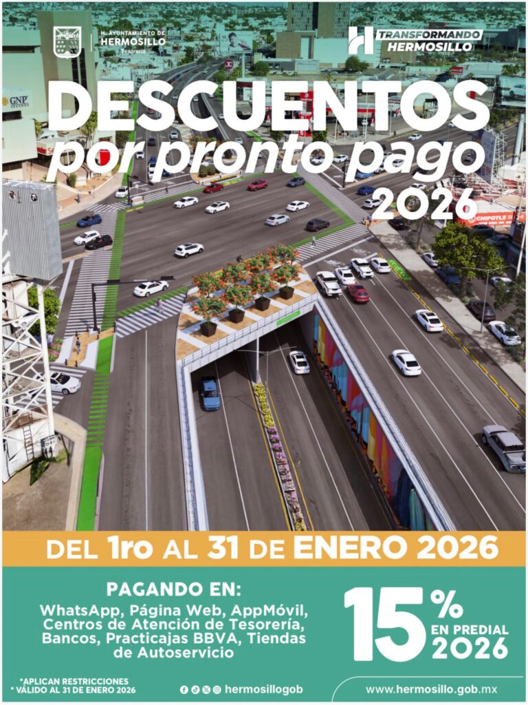 Hermosillo, Sonora; 5 de enero, 2026.- El Ayuntamiento de Hermosillo, a través de Tesorería Municipal, invita a las y los contribuyentes a aprovechar el 15% de descuento por pronto pago del Predial 2026, vigente del 1 al 31 de enero.