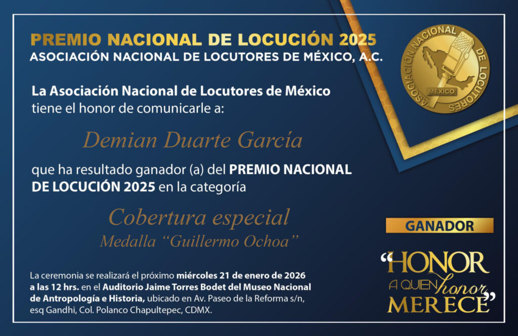 El miércoles pasado tuve el honor y la deferencia de recibir a nombre propio, de mi proyecto y del equipo que me apoya, el premio nacional de locución en la categoría de cobertura noticiosa, presea que entrega la Asociación Nacional de Locutores de México.