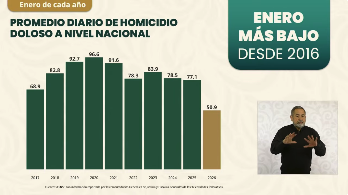 CIUDAD DE MÉXICO.- Al cierre del mes de enero el gobierno federal reportó que la incidencia de homicidios dolosos en todo el país sigue a la baja, al darse un nuevo descenso equivalente a 2 puntos porcentuales, para configurar el mes de enero con menos violencia en los últimos 10 años.