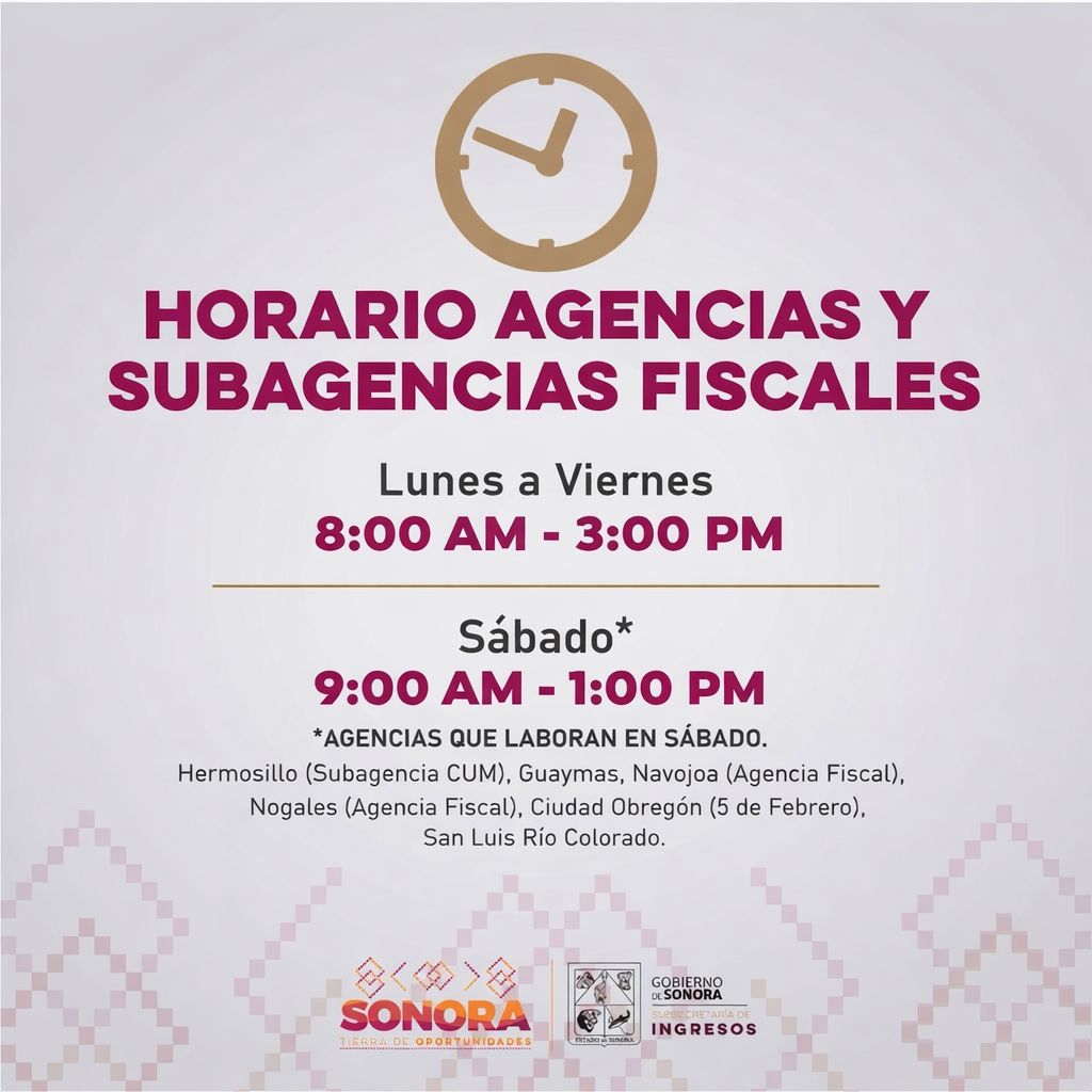Hermosillo, Sonora; 10 de febrero.– El Gobierno de Sonora, a través de la Subsecretaría de Ingresos de la Secretaría de Hacienda, informa que los horarios de atención al contribuyente en las agencias y subagencias fiscales del estado son de lunes a viernes, de 8:00 a 15:00 horas.