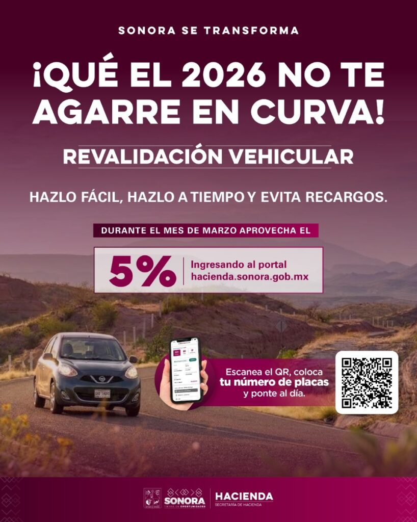 Hermosillo, Sonora; 5 de marzo de 2026.- El Gobierno de Sonora, a través de la Secretaría de Hacienda, invita a las y los contribuyentes que no han realizado su revalidación vehicular a aprovechar los descuentos y evitar recargos.