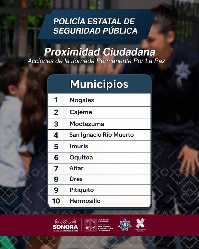 Zulema Guadalupe López Alday, titular de la división de Proximidad Ciudadana, informó, han visitado durante el año espacios educativos, plazas públicas y empresas en los municipios de Hermosillo, Nogales, Cajeme, Moctezuma, San Ignacio Río Muerto, Imuris, Oquitoa, Altar, Úres, Pitiquito y comunidades del poblado Miguel Alemán, en coordinación con el Centro Estatal de Prevención del Delito y Participación Ciudadana.